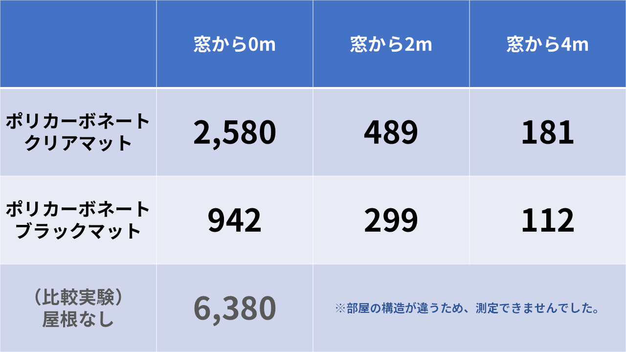 こうして数字で見ると、屋根の有無や種類によって、室内の明るさがいかに大きく変わるかがよくわかります。