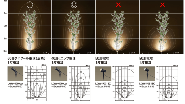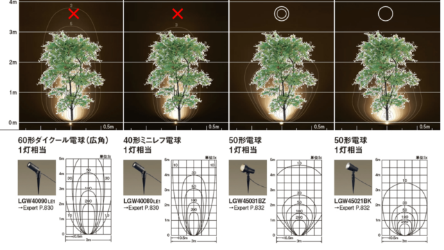 こういった木の形や植栽の背の高さなどに合わせてライトを選ぶのが大事です。